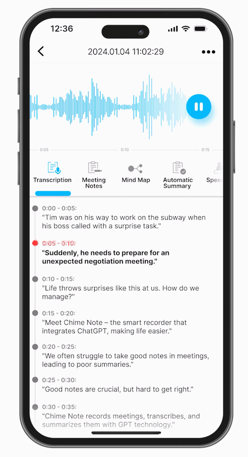 Effortlessly transform recordings into accurate transcriptions with Chime Note's app, eliminating the hassle of manual organization. Enjoy the convenience of breaking down lengthy speeches into paragraphs for easy navigation and review.